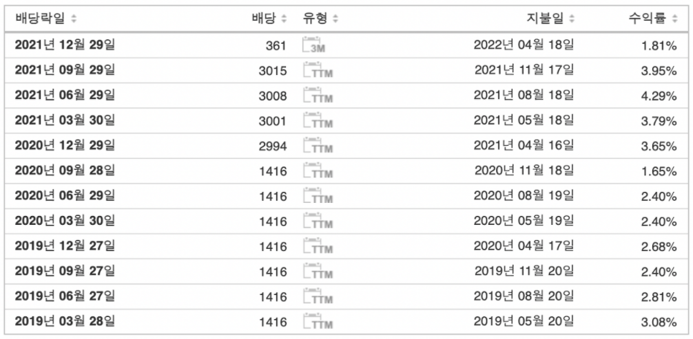 매수마감일 배당락일 배당기준일 배당금 지급일 2021-12-28 2021-12-29 2021-12-30 2022년 4월중 2022-03-29 2022-03-30 2122-03-31 2022년 5월중 2022-06-28 2022-06-29 2022-06-30 2022년 8월중 2022-09-28 2022-09-29 2022-09-30 2022년 11월중 2022-12-27 2022-12-28 2022-12-29 2023년 4월중 매수마감일 : 매수마감일 까지 주식매수를 하셔야 분기 배당금을 받으실수 있습니다.