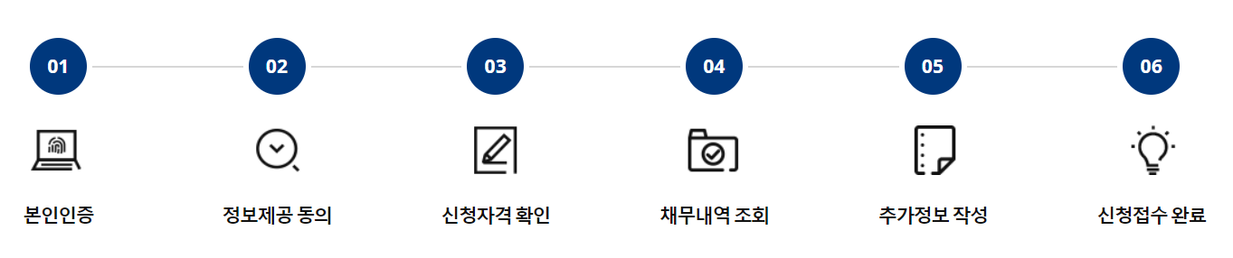 소상공인 새출발기금 신청방법 소상공인 새출발기금 신청순서는 1.본인인증후 2.정보제공동의 3.신청자격확인 4.채무내역 조회 5.추가정보작성 6.신청접수 완료 순으로 진행됩니다.