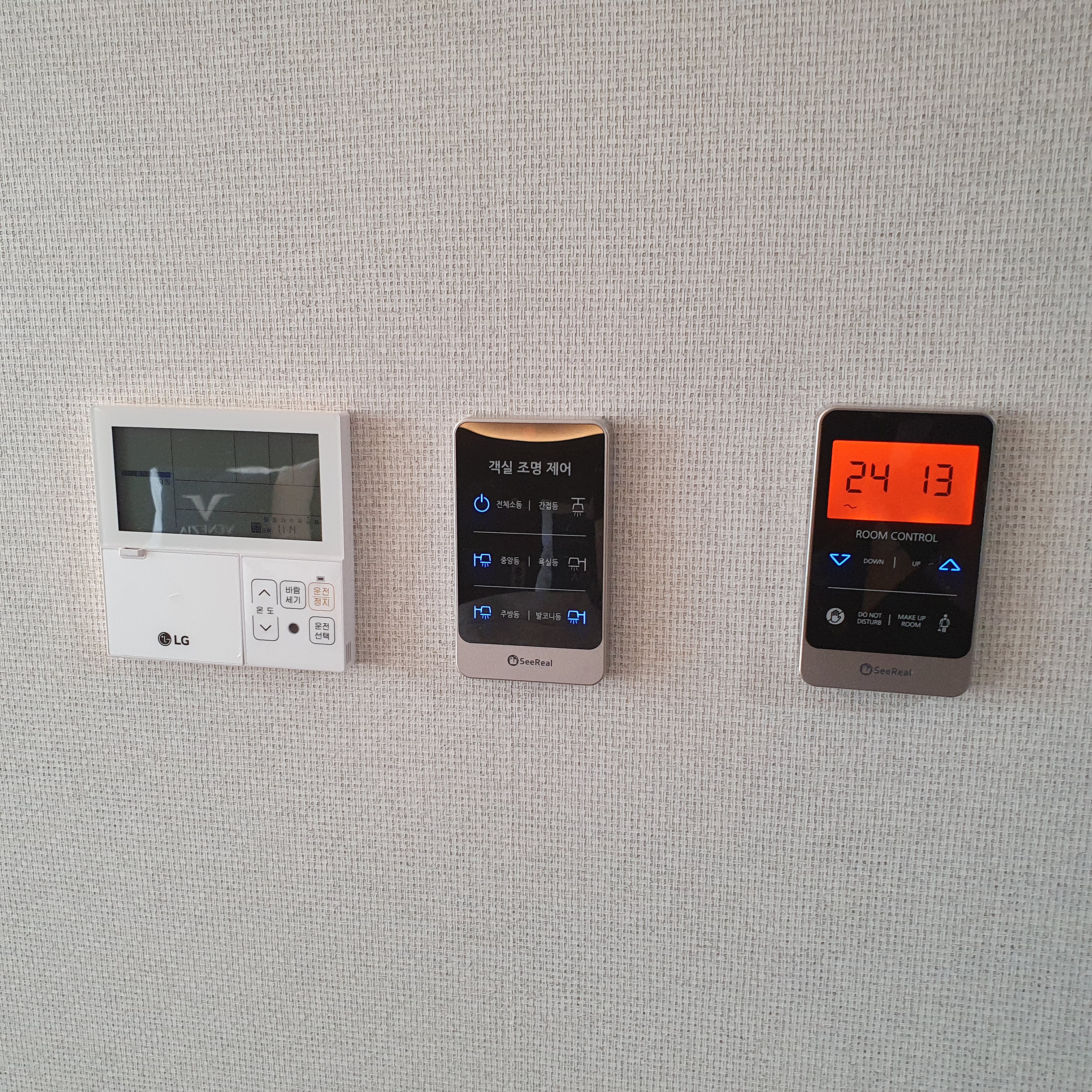 여수 베네치아호텔앤리조트 객실온도조절기와 조명을제어할수 있습니다. 보일러가 들어와서 바닥온도도 조절할 수있고 객실의