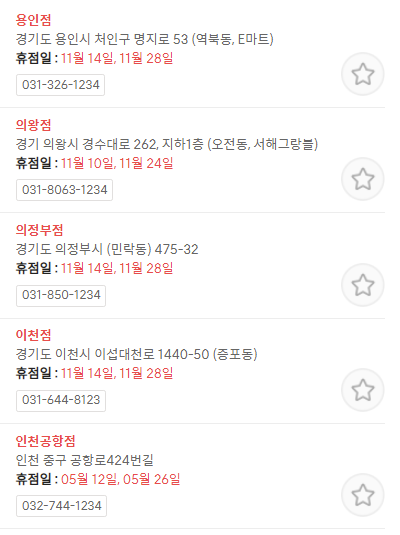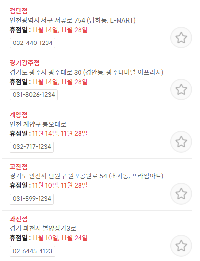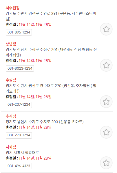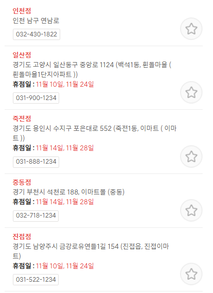 11월10일, 11월24일 수요일 휴무점 및 연락처 : 킨텍스점, 파주운정점, 파주점, 평촌점, 포천점, 풍사점, 화정점