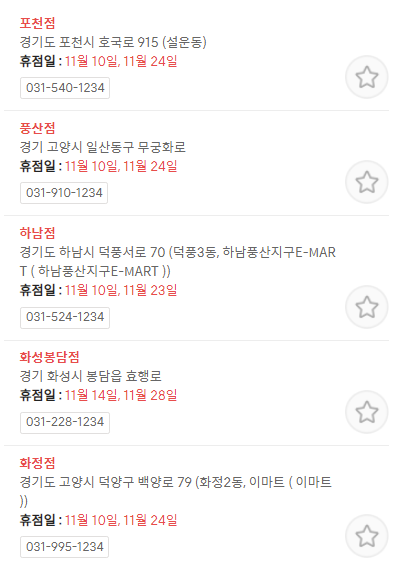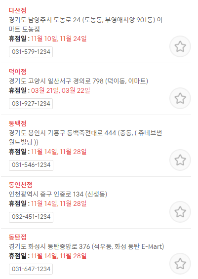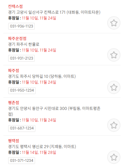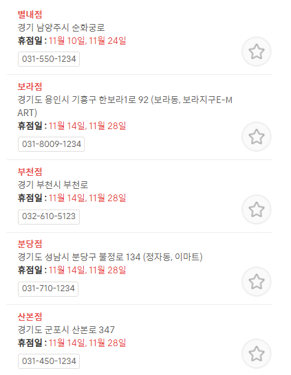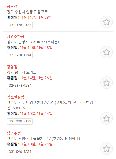 11월 이마트 휴무일 11월10일, 11월24일 수요일 휴무점 및 연락처 : 다산점, 별내점