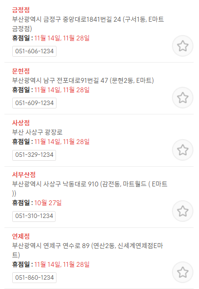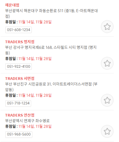 11월 이마트 휴무일 11월14일, 11월28일 일요일 휴무점 및 연락처 : 금정점, 문현점, 사상점, 연제점, 해운대점, 명지점,
