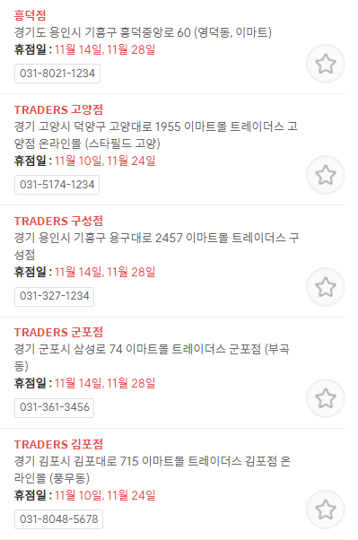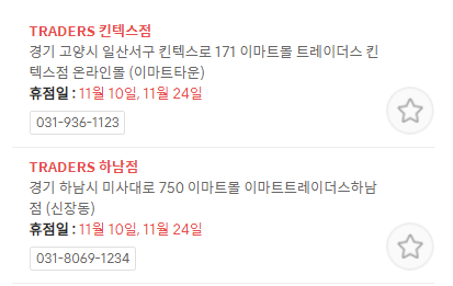 11월 이마트 휴무일 11월14일, 11월28일 일요일 휴무점 및 연락처 : 흥덕점, 구성트레이더스, 군포트레이더스, 부천트레이더스,