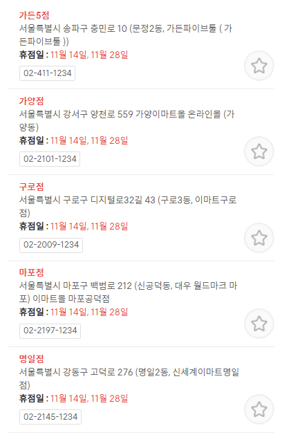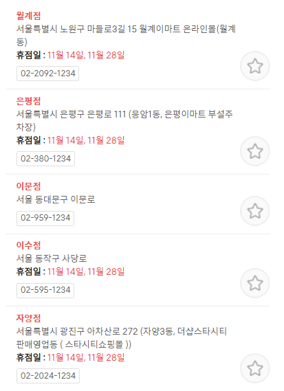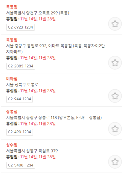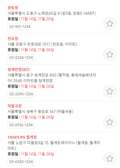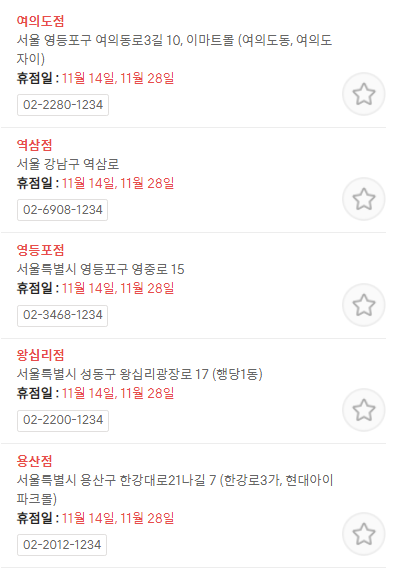 11월 이마트 휴무일 수색점, 수서점, 신도림점, 신월점, 신촌점, 양재점, 여의도점, 역삼점, 영등포점, 왕십리점, 용산점, 휴무일 및 연락처