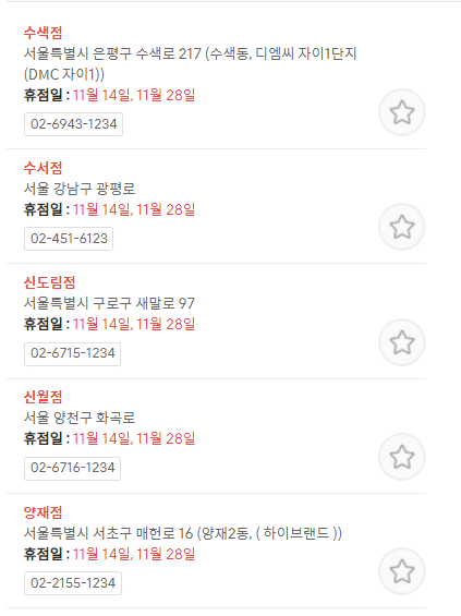 11월14일, 11월28일 일요일 휴무점 및 연락처 : 동백점, 동인천점, 동탄점, 보라점, 부천점, 분당점, 산본점