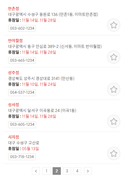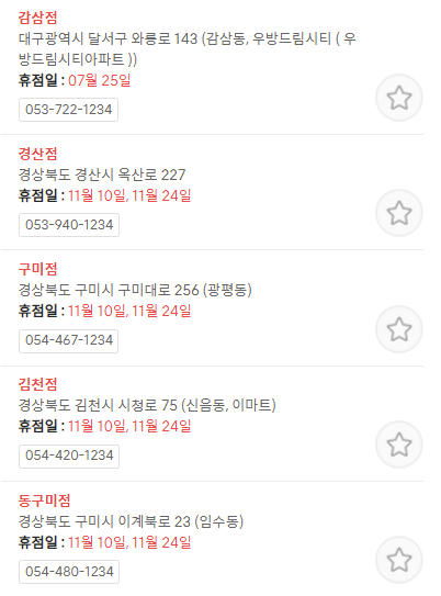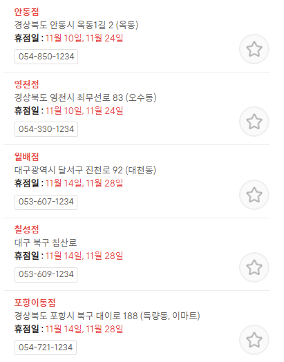 11월10일, 11월24일 수요일 휴무점 및 연락처 : 경산점, 구미점, 김천점, 동구미점, 상주점