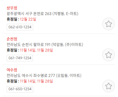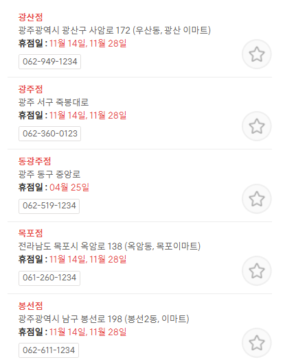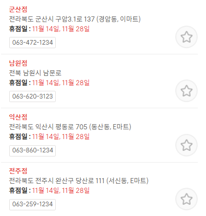 전라도 지역 (11월 이마트 휴무일, 11월 14일 일요일, 28일 일요일)