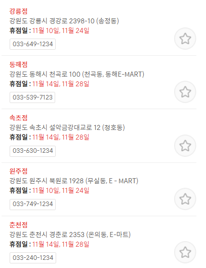 강원 지역 (11월 이마트 휴무일, 지역마다 약간씩 상이함, 아래확인)