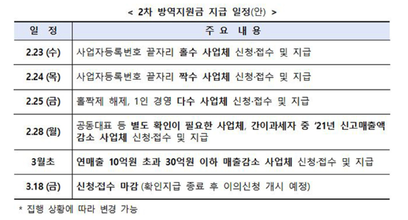 2. 연매출 10억원 초과, 30억원 이하 매출이 감소한 기업은 다음달 초 신청과 지급을 시작합니다.2차 방역지원금 신청과 접수는 다음달 18일 마감되며. 지급 종료가 확인되면 이의 신청 기한을 둘예정입니다.
