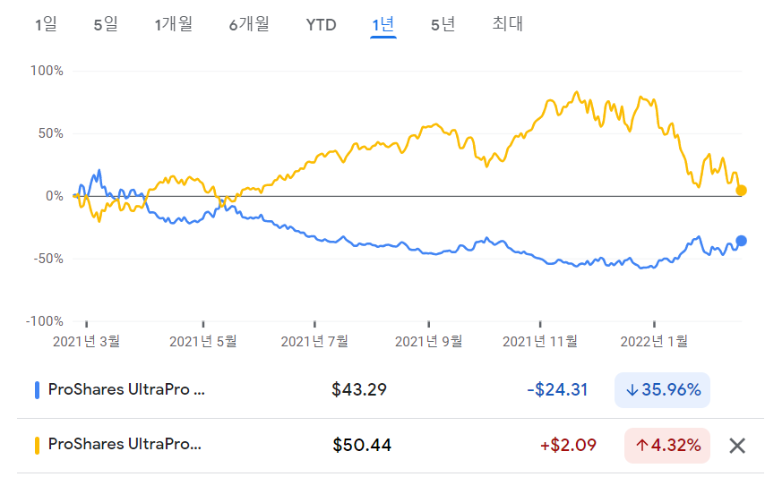 SQQQ와 TQQQ의 1년간의 그래프추이 위의 이미지를 참고하시면 노라 파란색이 SQQQ, 노란색이 TQQQ입니다.